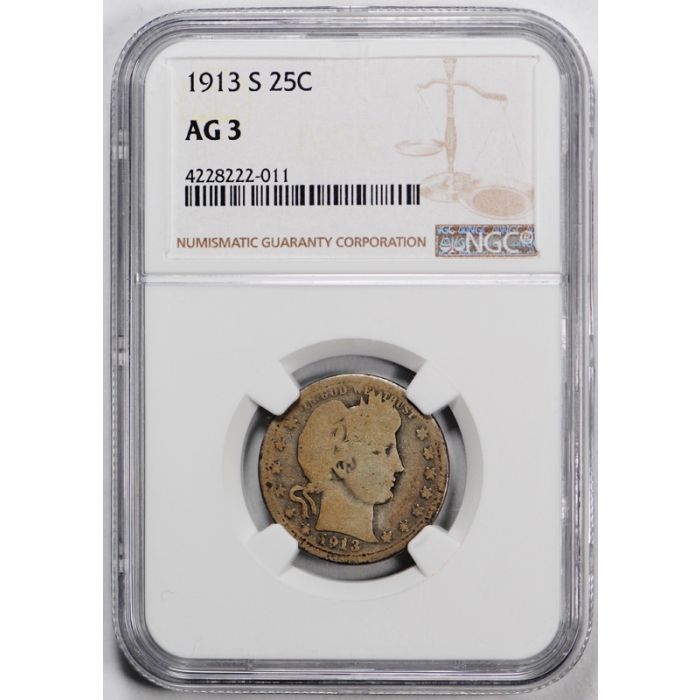 Description / 1913 S Barber Quarter 25C NGC AG 3 About Good Key Date Strong For Grade