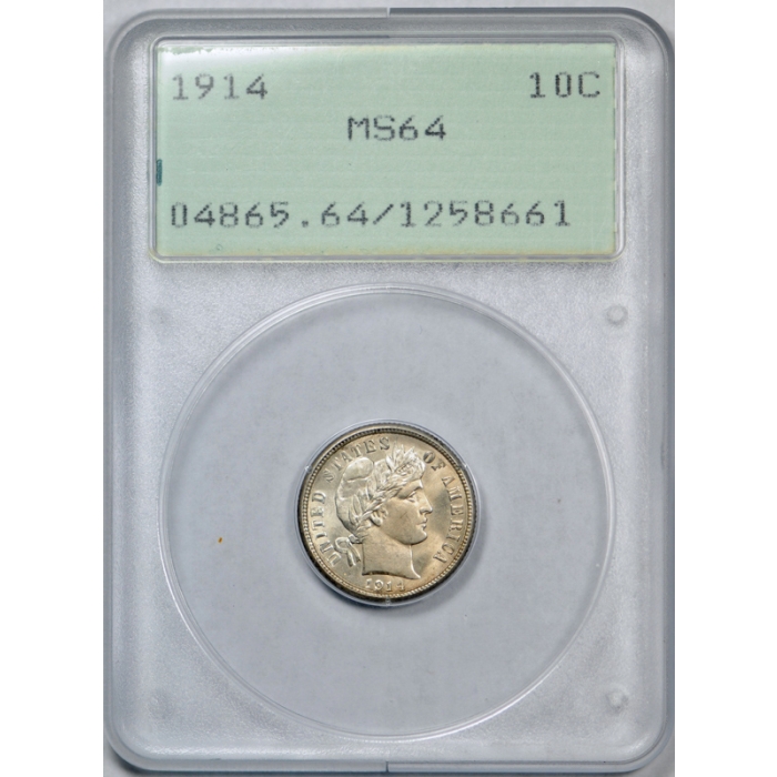Description / 1914 10C Barber Dime PCGS MS 64 Uncirculated Old Rattler Holder Nice !