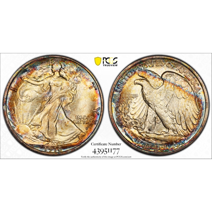 Description / 1916 S 50C Walking Liberty Half Dollar PCGS MS 62 Colorful Toned Exceptional !