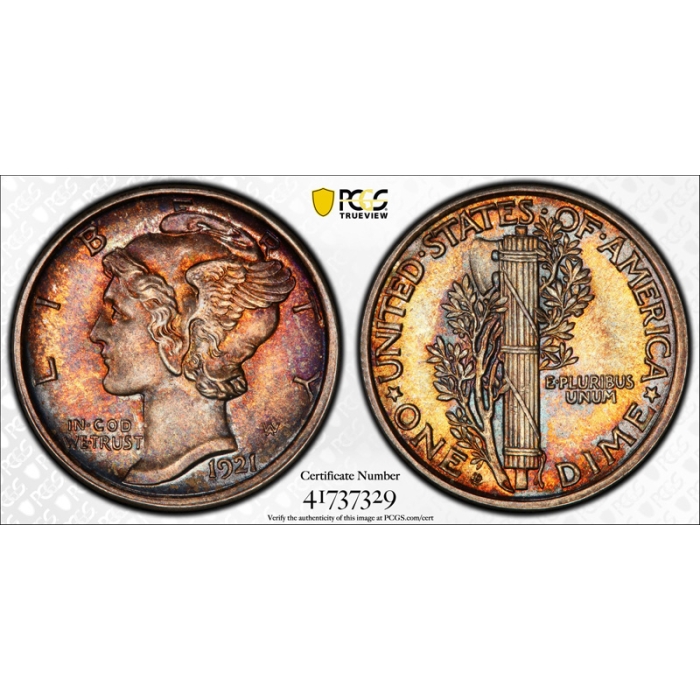 Description / 1921 D 10C Mercury Dime PCGS MS 65 FB Uncirculated Full Bands Key Date Colorful Toned Beauty !