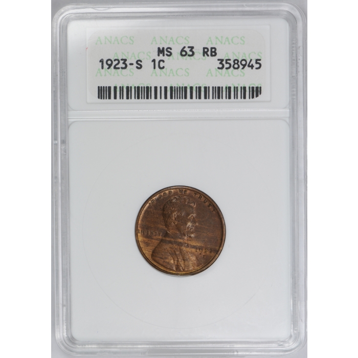 Description / 1923 S Lincoln Cent ANACS MS 63 RB Uncirculated Red Brown Tough Date