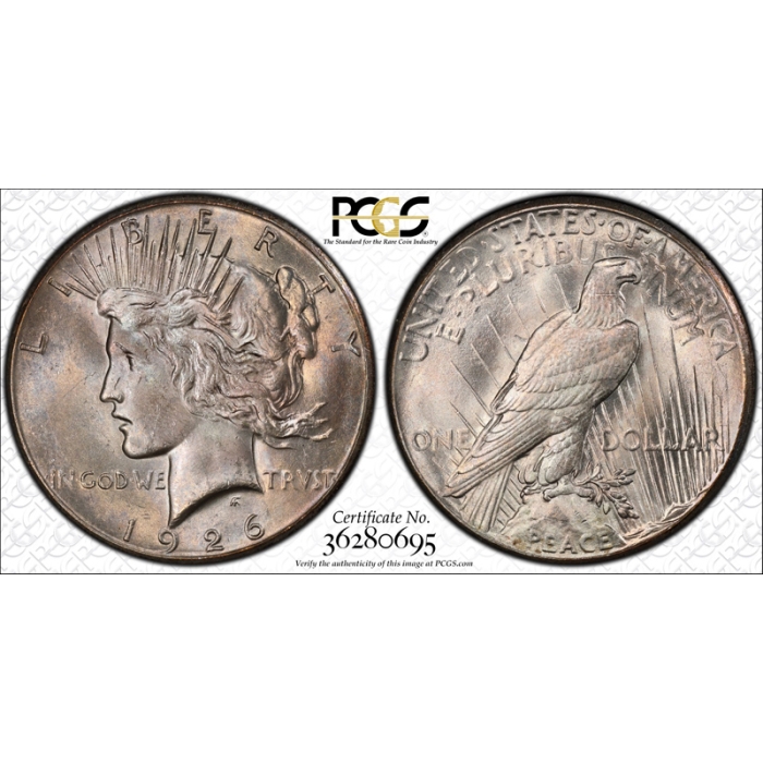 Description / 1926 $1 Peace Dollar PCGS MS 63 Uncirculated Light Pink / Purple Toned Pretty Coin !