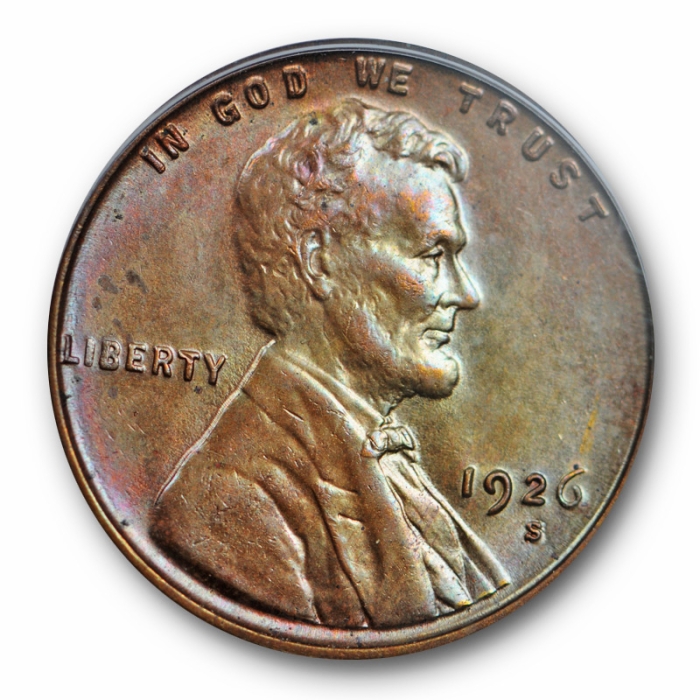 Description / 1926 S 1C Lincoln Wheat Cent PCGS MS 63 RB Red Brown Green / Purple Toned !