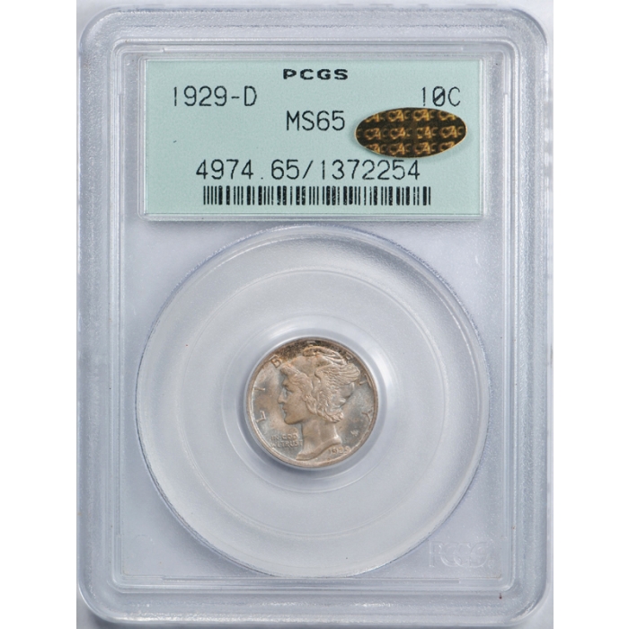 Description / 1929 D 10C Mercury Dime PCGS MS 65 Uncirculated OGH Gold CAC Sticker !