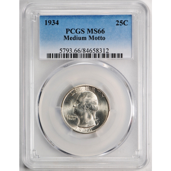 Description / 1934 25C Medium Motto Washington Quarter PCGS MS 66 Blazing Blast White
