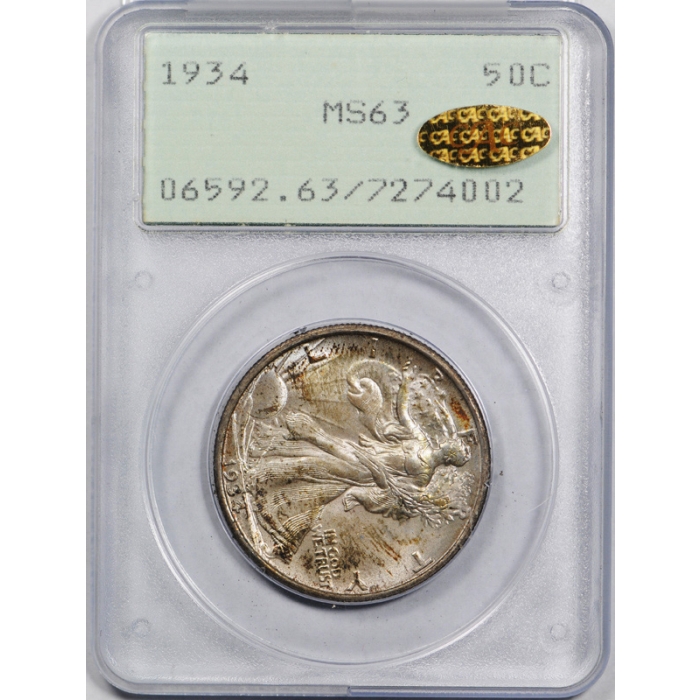 Description / 1934 50C Walking Liberty Half Dollar PCGS MS 63 Uncirculated Rattler Gold CAC Sticker