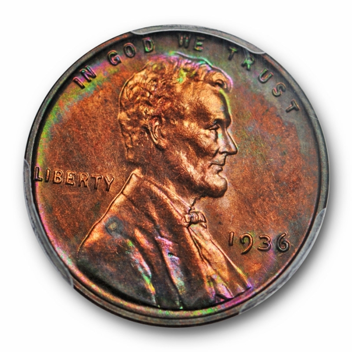 Description / 1936 1C Satin Proof Lincoln Wheat Cent PCGS PR 64 RB Red Brown Rainbow Toned Pretty