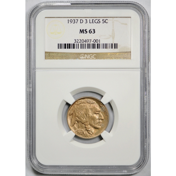 1937 D 5C Three Legged Buffalo Head Nickel NGC MS 63 Uncirculated 3 Legs Cert#7001