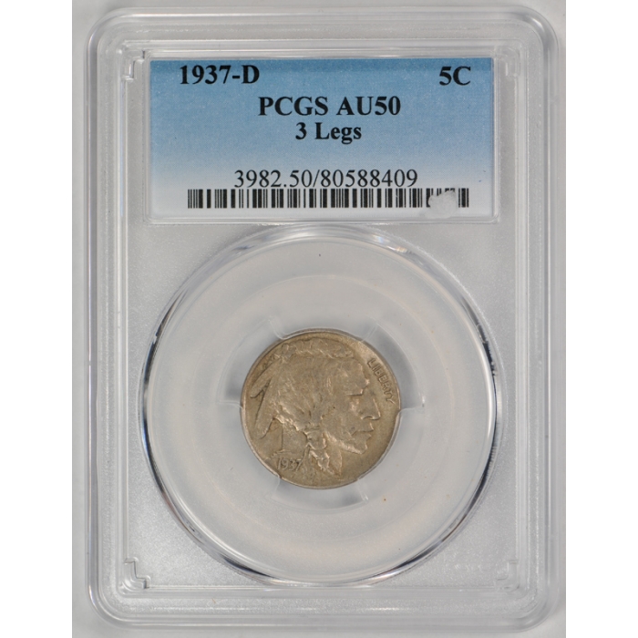 Description / 1937-D 5C 3 Legs Buffalo Nickel PCGS AU 50 About Uncirculated three legged