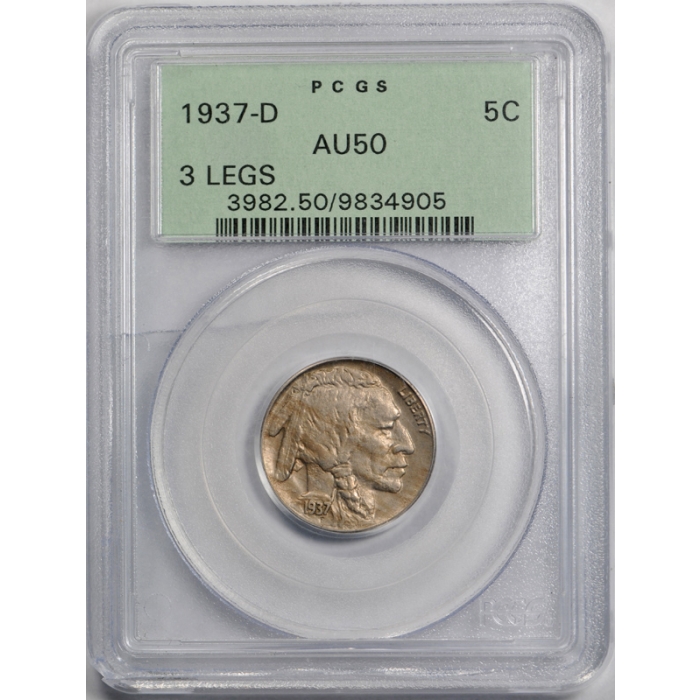Description / 1937 D 5C 3 Legs Buffalo Nickel PCGS AU 50 About Uncirculated OGH Three Legged