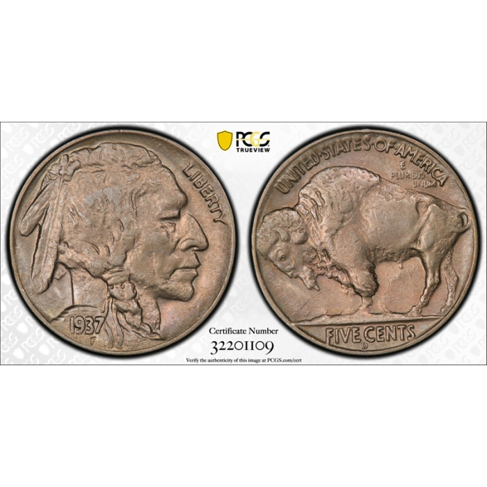Description / 1937 D 5C 3 Legs Buffalo Head Nickel PCGS AU 55 About Uncirculated CAC Three Legged