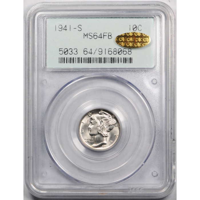 1941 S 10C Mercury Dime PCGS MS 64 FB Uncirculated Gold CAC Sticker OGH