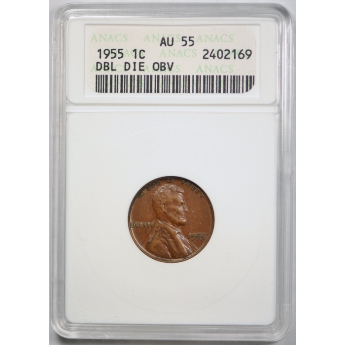 Description / 1955 1C Doubled Die Obverse Lincoln Wheat Cent ANACS AU 55 1955/1955 DDO !