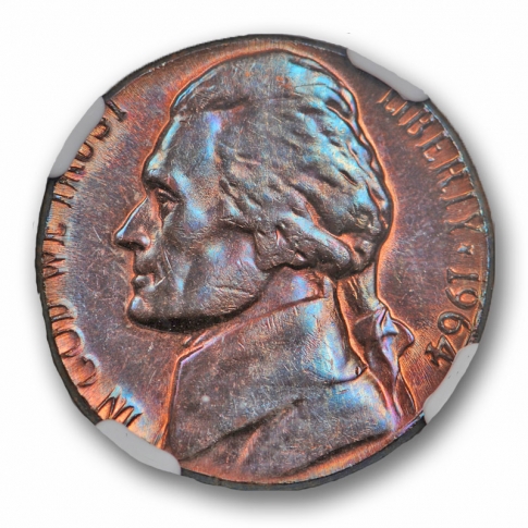 Description / 1964 D 5C Jefferson Nickel NGC MS 64 RB Uncirculated Nickel Struck on a Cent Planchet
