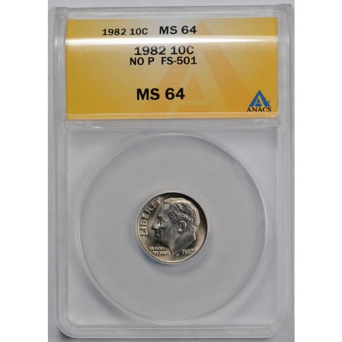 Description / 1982 10C No P Mintmark - Strong Roosevelt Dime ANACS MS 64 FS -501