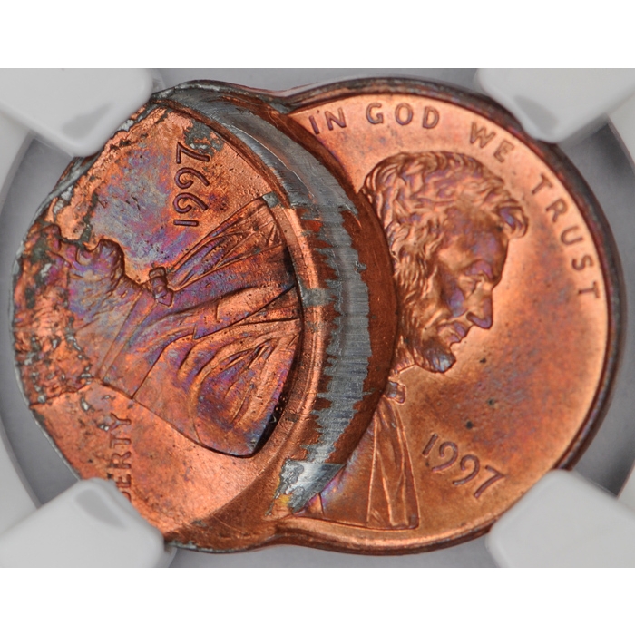 Description / 1997 Lincoln Cent NGC MS 64 RB Double Struck Off Center 2nd Strike 50% Off Error