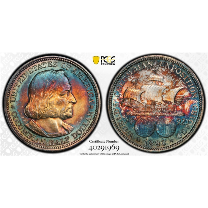 Description / 1893 Columbian 50C Silver Commemorative Half Dollar PCGS MS 63+ Monster Toned !